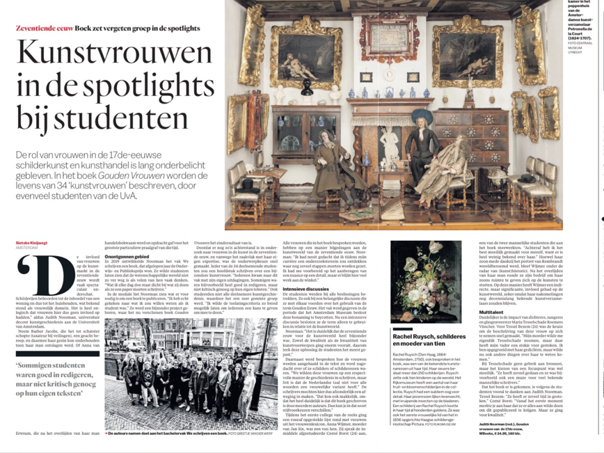 The UvA Bachelor course “We schrijven een boek” (We Are writing a book) resulted in the book “Gouden vrouwen van de 17de eeuw” (Golden Women of the 17th century). Under the supervision of Judith Noorman and with help from several professionals, the group of students wrote a book on women artists, collectors and patrons in just a few weeks’ time.